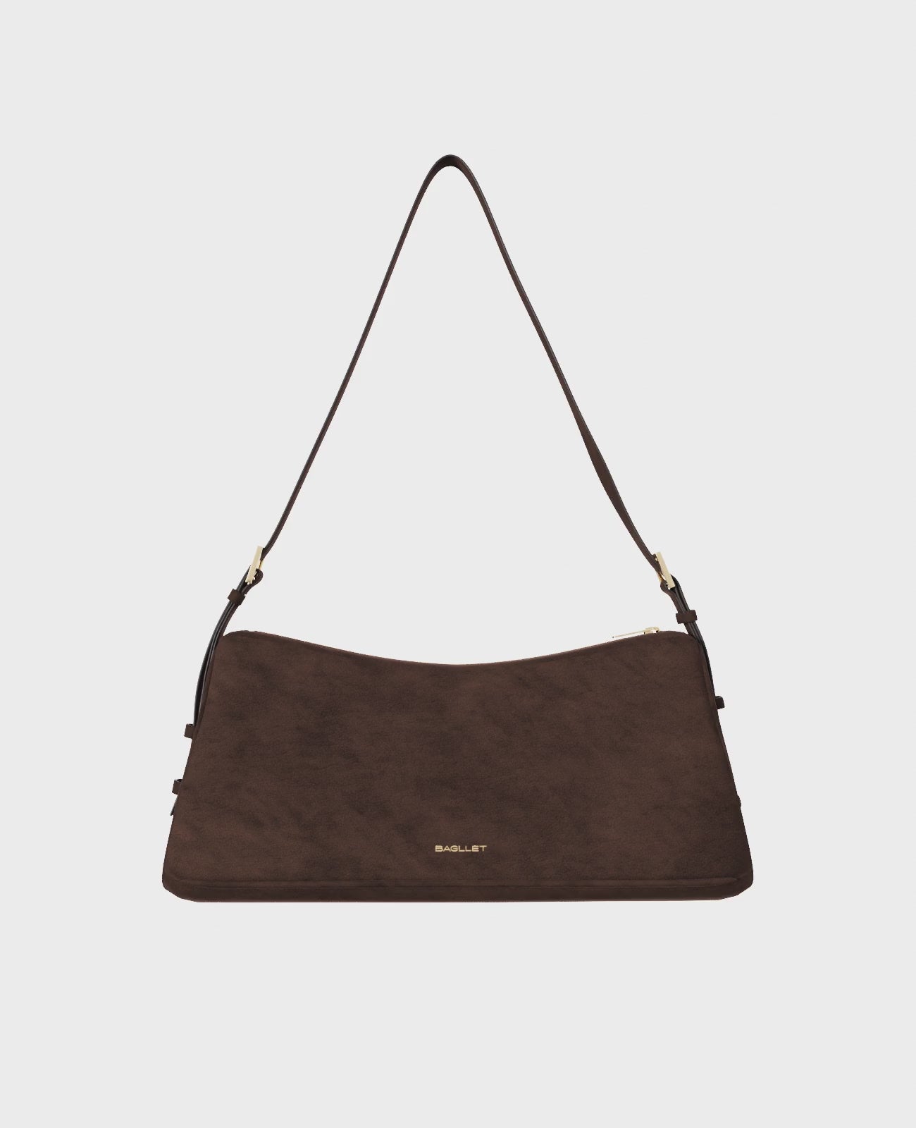 BG201 — a new model in the Bagllet line. An elongated trapezoidal shape that offers a fresh take on the classic baguette bag, made from high-quality Italian suede that creates a relaxed look and over time, it adds a unique character to the piece, with golden hardware. The bag's lining is made of Alcantara, providing a pleasant tactile sensation, with reinforcing elements for a firm structure. The main compartment closes with a zipper, and there’s also an inner pocket for small items, measuring 20 x 10 cm. The long strap allows you to adjust the accessory to any look and mood, as it is adjustable from 70 to 100 cm. The bag's size is 40 x 19 x 13 cm, making it the perfect everyday basic option.