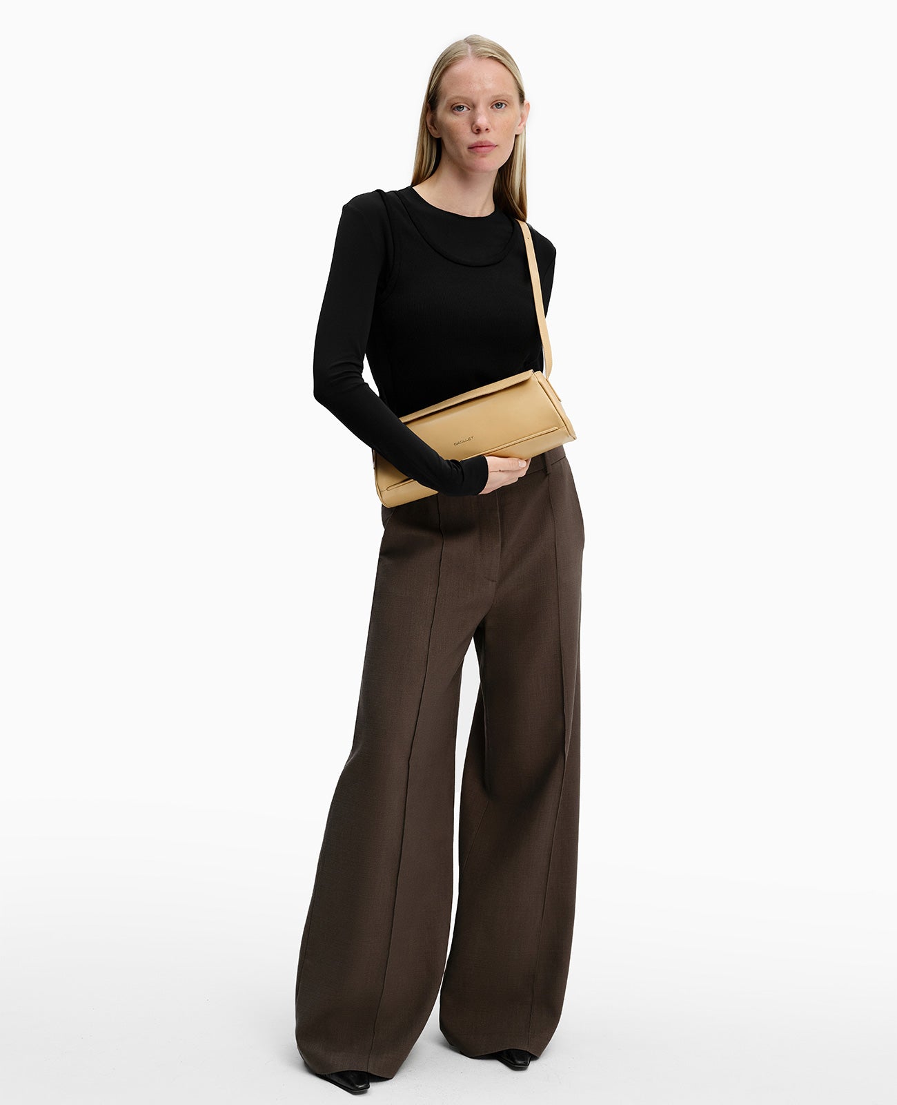 BG211 — another interpretation of BAGLLET’s baguette bag, a variation on how to play with trapezoidal silhouettes and elongated proportions. The bag has rounded flowing corners, delicate soft leather, and sharp edges that bring structure and a refined look. A wide adjustable strap 60–110 cm adds versatility to styling. We chose a compact yet classic size — 33 х 12 х 10 cm (narrowing to 5 cm), with an inner pocket 8 х 20 cm for essentials, and four colorways: black, brown, beige, and burgundy.